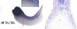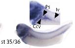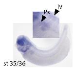 ephb1 (EPH receptor B1) gene expression in X. laevis embryo, assayed whole-mount via situ hybridization (WISH) at NF stage 35 & 36, lateral view, anterior left, dorsal up. Transverse section at level of pronephros.