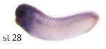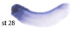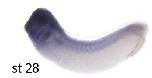efna4 (ephrin A4) gene expression in X. laevis embryo, assayed whole-mount via situ hybridization (WISH) at NF stage 28, lateral view, anterior left, dorsal up.
