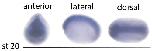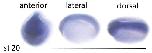 efna4 (ephrin A4) gene expression in X. laevis embryo, assayed whole-mount via in situ hybridization (WISH) at NF stage 20, anterior, lateral and dorsal views.