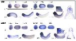 efna1 (ephrin A1) gene expression in X. laevis embryo, assayed whole-mount via situ hybridization (WISH) at NF stage 17, anterior, lateral and dorsal views.