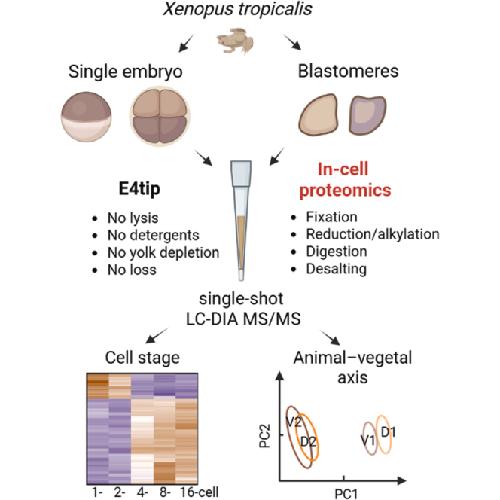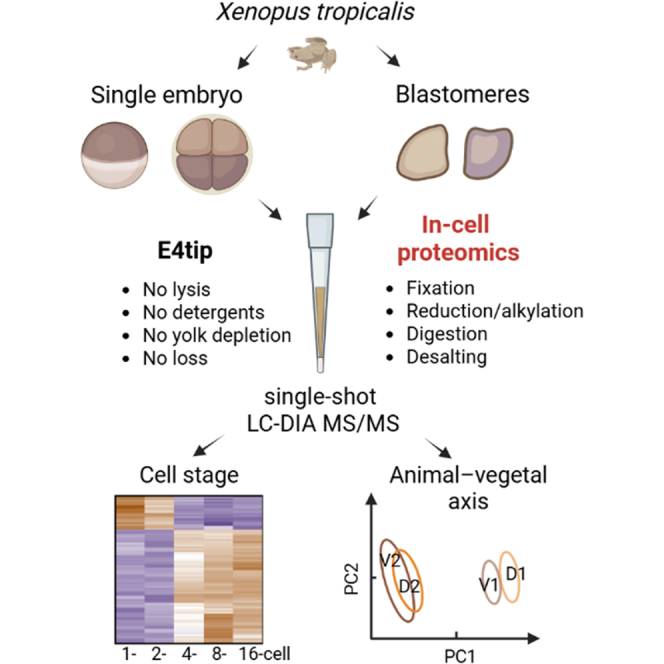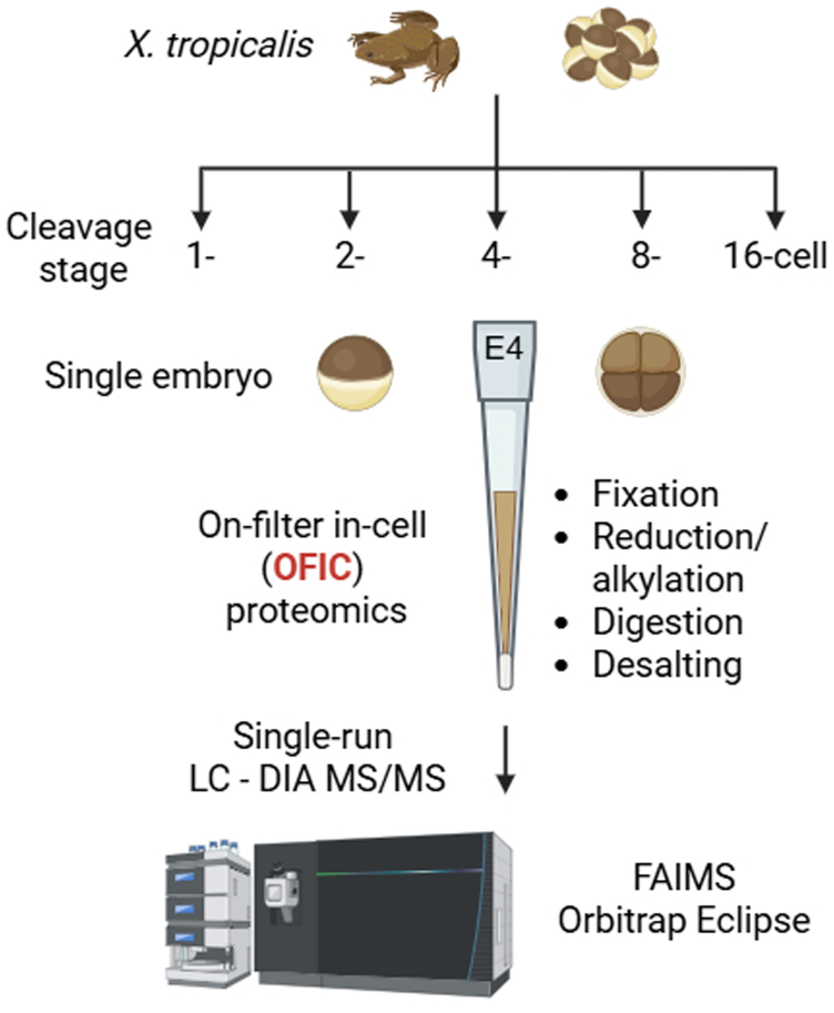Fig. 1. Workflow of the “in-cell proteomics” approach for Xenopus tropicalis embryo analysis. Embryos were collected at 1-, 2-, 4-, 8-, and 16-cell stage, respectively. One embryo was used for each digestion experiment, and four embryos (biological replicates) were processed independently for each cleavage stage using E4tip. Mass spectrometric analysis was performed using Orbitrap Eclipse with FAIMS Pro Interface in data-independent acquisition mode. FAIMS, field asymmetric ion mobility spectrometry.