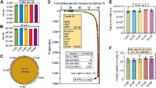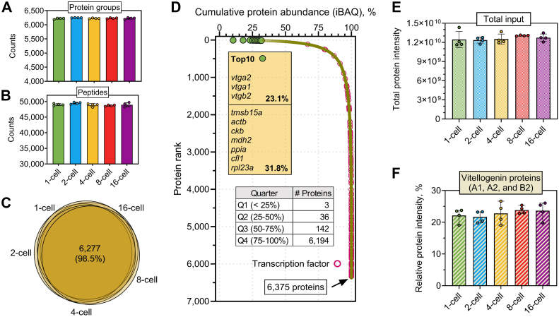 Fig. 2. Evaluation of the in-cell proteomics approach for Xenopus tropicalis embryo proteomic analysis.A and B, identification of protein groups and peptides across the five cleavage stages. Error bars indicate four biological replicates. C, Venn diagrams. The number and percentage indicate the shared proteins among the five stages. D, protein rank plot. The top 10 most abundant proteins were highlighted in green in the curve and were indicated in the text box. Transcription factors are highlighted in orange circles. The inner table shows the number of proteins in each quarter. E, total protein input of the five stages. The combined intensities of all the identified proteins derived from each stage were plotted. F, percentage of yolk proteins among the five stages. The intensity of three major vitellogenin proteins (A1, A2, and B2) were summed and divided by the overall protein intensity of each stage. Error bars indicate four biological replicates in this study.