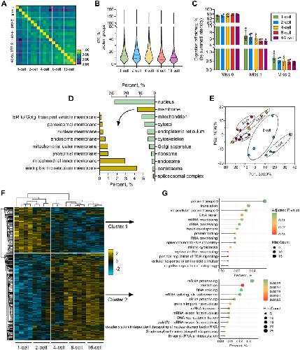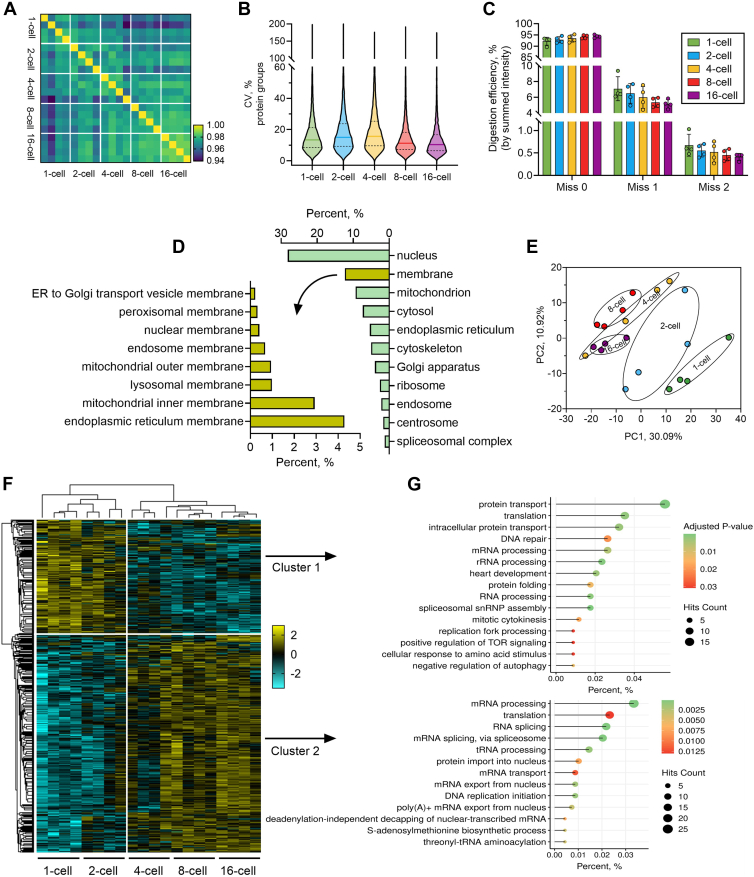 Fig. 3. Proteomics analysis of early embryos.A, Pearson’s correlation analysis. B, coefficient of variation of the protein groups among the five stages. Horizontal solid lines indicate the median value. C, digestion efficiency. The summed intensity of peptides carrying one and two missed cleavages were divided by the total peptide intensity. D, cellular compartment analysis of the overall Xenopus tropicalis embryo proteome. E, principal component analysis. F, heatmap of the ANOVA significant (false discovery rate = 0.05) proteins among the five stages. Two clusters were highlighted. Z-scored protein intensity values were plotted. G, Gene Ontology biological process analysis of proteins in cluster 1 and cluster 2, respectively.