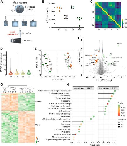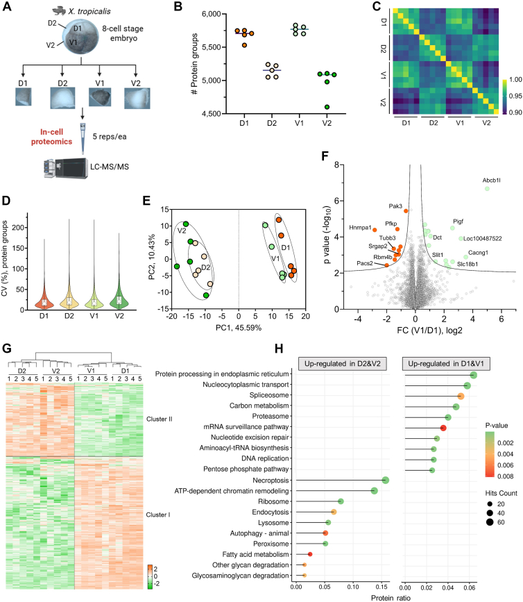 Fig. 4. Spatial proteomic profiling of 8-cell stage Xenopus tropicalis embryos using the OFIC approach.A, workflow of the OFIC approach for spatial proteomics analysis of 8-cell stage X. tropicalis embryos. B, protein group identifications. C, Pearson’s correlation. D, protein group coefficient of variation. E, principal component analysis. F, volcano plot of comparison between dorsal animal (D1) and ventral animal (V1) blastomeres. Dotted lines indicate permutation FDR of 0.05 and 0.01, respectively. G, heatmap of ANOVA significant proteins (FDR = 0.01). H, KEGG pathway analysis of the two cluster of proteins shown in G. Top 10 enriched terms of each cluster were plotted. FDR, false discovery rate; KEGG, Kyoto Encyclopedia of Genes and Genomes; OFIC, on-filter in-cell.