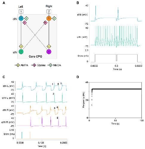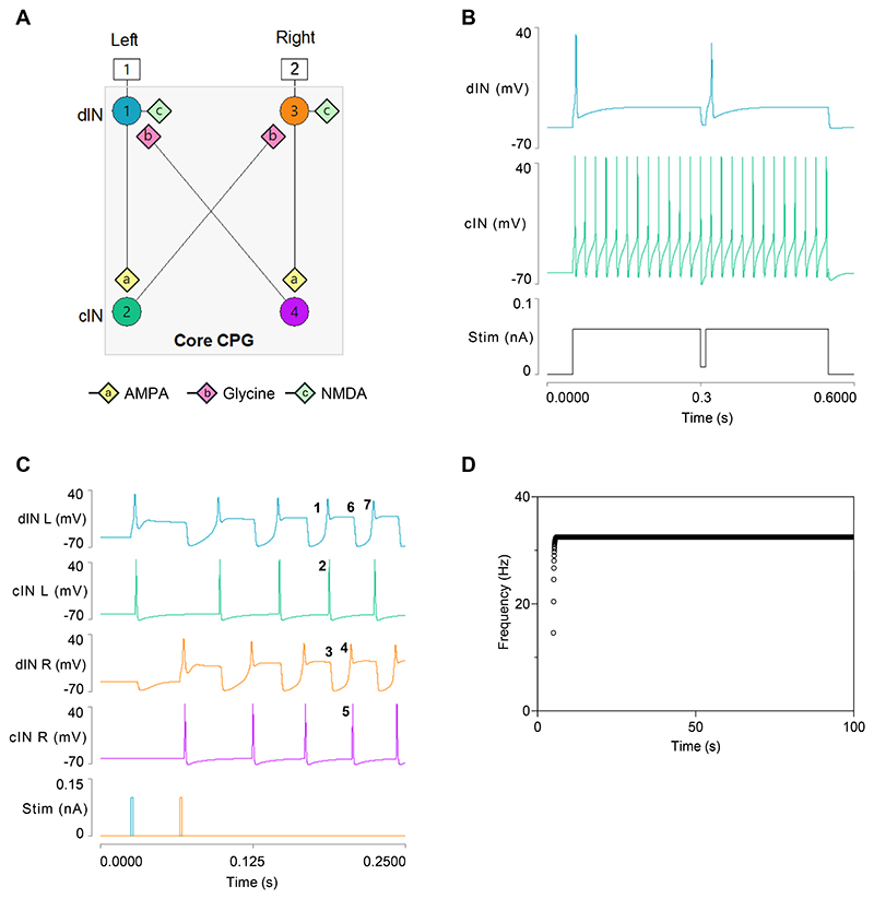 Fig. 1. The core 4-neuron circuit for generating swimming.A: Organisation of the model circuit. B: Responses of synaptically-isolated dIN (top trace) and cIN (middle trace) neurons to a sustained depolarizing stimulus (bottom trace), briefly interrupted at the midpoint. C: A swim episode initiated by a pair of brief (2 ms) depolarizing stimuli (+0.1 nA) applied to left and right dINs with a time separation of 40 ms. Numbers 1-7 identify the sequence of events involved in one cycle of a swim rhythm, starting with a spike in a left dIN (1) and ending with a spike in the same neuron at the next cycle (7). Traces from top: left dIN, left cIN, right dIN, right cIN, stimulus. D: Frequency vs time plot shows that after reaching plateau, swimming continues indefinitely at a steady frequency of 32 Hz. |