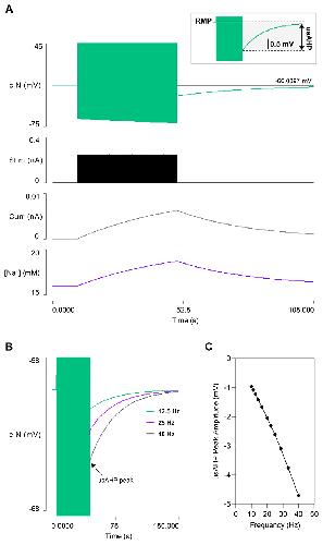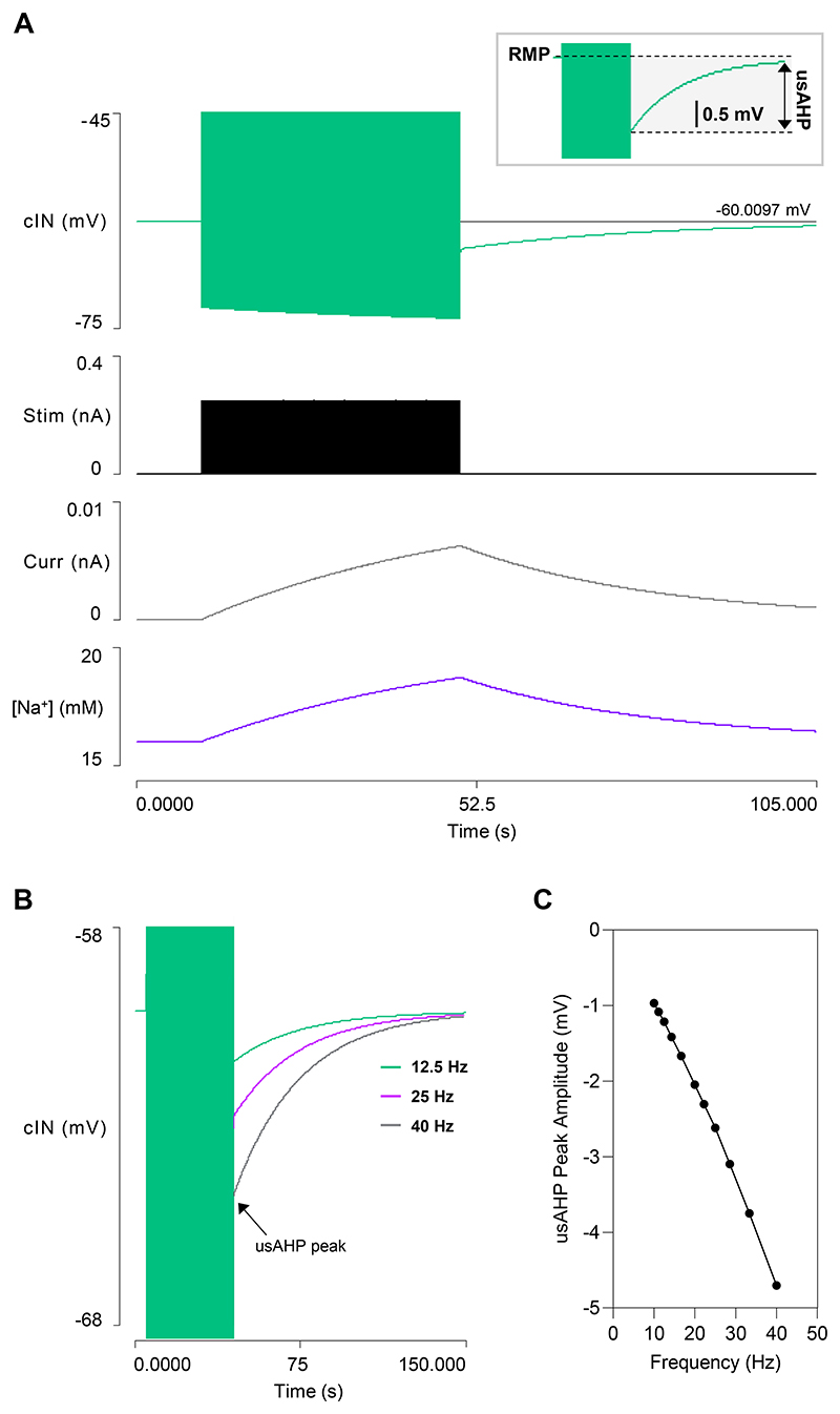 Fig. 2. Generating a usAHP in a cIN in a quiescent preparation.A: A 40 s train of brief supra-threshold depolarising stimuli (trace 2) at 33.3 Hz generates a usAHP in a cIN (trace 1, spikes truncated, horizontal cursor marks the RMP). The sodium pump current (trace 3), and [Na+]i (trace 4) increase during the stimulus and decrease upon its termination. Inset is an expanded excerpt of the usAHP generated by the cIN. B: An enlarged view of the cIN membrane potential in response to stimulation at 12.5 (green), 25 (purple), 40 Hz (grey); arrow highlights the peak of the usAHP. Both spike peaks and spike after-hyperpolarization are clipped. C: The usAHP amplitude measured immediately after the stimulus train terminates is dependent on spike frequency. |