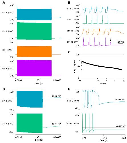 Fig. 4. Model 3 output after adding dynamic sodium pumps and HCN channels to dINs.A: A swim episode generated in the four neurons of the CPG, lasting ~46s. B: Expanded trace reveals that the swim episode in A terminates due to spike failure in the right cIN (arrow). C: The cycle frequency profile during the swim episode. D: Shortly after episode termination, the cIN generates a 5.4 mV usAHP (green, lower trace), while the usAHP in the dIN is only 1.8 mV (blue, upper trace). E: An expanded view of episode termination showing the brief large hyperpolarization of the dIN, followed by the sustained small usAHP. The cIN does not show this biphasic hyperpolarization, but the sustained usAHP is substantially larger than that in the dIN. Spikes truncated in D and E. |
