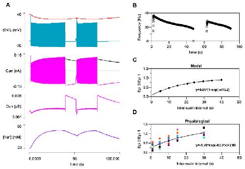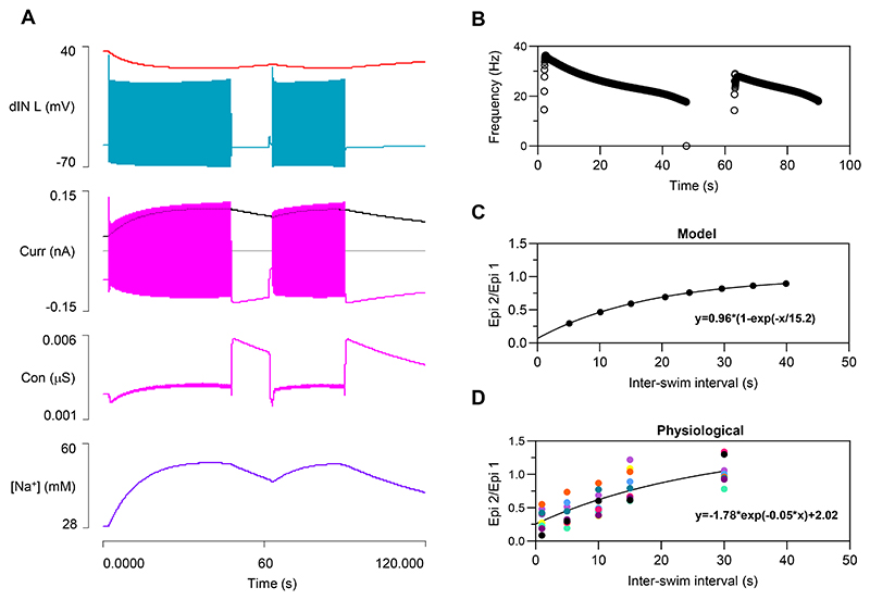 Fig. 7. STMM with dynamic pumps and Ih in dINs.A: Activity in the left dIN during STMM. Traces from top: sodium equilibrium potential (red), membrane potential (blue), sodium pump current (black), Ih current (magenta), Ih conductance (magenta), [Na+]i (purple). Horizontal grey cursor on the current axis marks the 0 level. B: Swim frequency vs time plot from A. C: The strength of the STMM (second episode duration divided by first) depends on the inter-episode interval. The relationship closely follows a bounded exponential curve (fitted trend line, equation on chart). D: The strength of STMM measured from real tadpoles (trendline from Prism graphing software). |