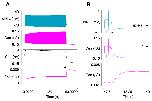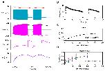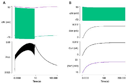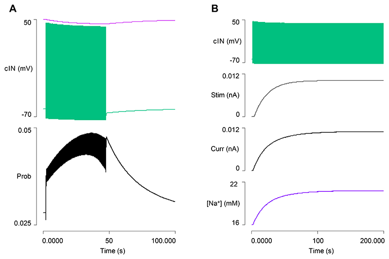 Fig. 9. Factors contributing to cIN spike failure and swim episode termination.A: There is a small but progressive de-inactivation of the A current in a cIN during a swim episode, and the sodium equilibrium potential declines. Traces from top: sodium equilibrium potential (magenta), membrane potential (green), inactivation gate open probability of the channel mediating IA (note small scale). B: Compensating for the hyperpolarizing pump current in cINs by injecting a mirror-image depolarizing current. Traces from top: membrane potential, stimulus current [defining equation: t < 4065? 0: 0.01011*(1-exp(-(t-4065)/19865))], pump current, [Na+]i. |