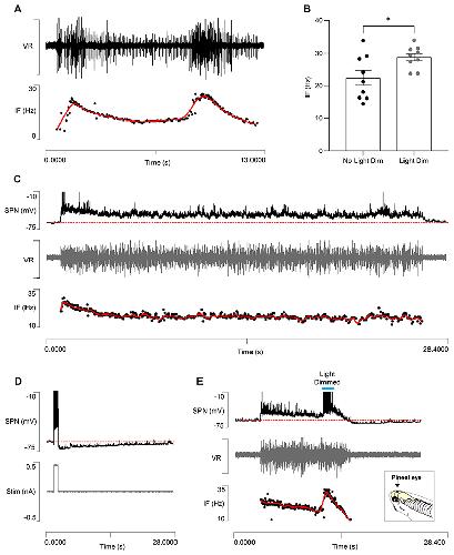 Fig. 11. Swim accelerations and neuron recruitment.A: A ventral root (VR, upper trace) recording from a real tadpole showing a spontaneous increase in burst intensity just before episode termination. A plot of the instantaneous cycle frequency (lower trace) shows that this is accompanied by an increase in frequency. The red line shows the frequency after LOWESS smoothing. B: Light dimming increases the peak instantaneous frequency towards the end of an episode compared to episodes that self-terminate without dimming. Data expressed as mean ± SEM, n=12 preparations. *p<0.05. C: Sample recording showing a stage 42 spinal neuron that only fired at the onset of a spontaneous swim episode (SPN, upper trace, spike peaks clipped). Note that there is no usAHP after the end of the episode (dashed red line shows the RMP). The ventral root recording (VR, middle trace) shows no sign of a terminal burst, and there is no increase in cycle frequency at the end of the episode (lower trace, IF, as in A). D: The same neuron generated a usAHP following a burst of spikes induced by a depolarising current step (lower trace) during a quiescent (non-swimming) period. E: Light dimming part-way through a spontaneous swim episode activates the dorsal forebrain pineal gland (inset arrowed; diagram courtesy of Dr S.R. Soffe, with permission) and induces a burst of spikes in the SPN, which now generates a usAHP at episode termination, which followed shortly after. The ventral root recording (middle trace) and instantaneous cycle frequency plot (lower trace) show the dimming-induced increase in intensity and frequency. |