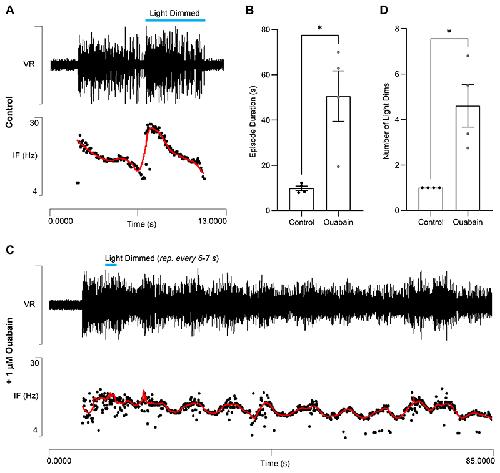 Fig. 12. Sensitivity of light dimming response to ouabain.A: Light dimming caused acceleration in an electrically evoked swim episode prior to its termination (ventral root recording, upper trace; instantaneous frequency, lower trace, red line shows LOWESS smoothing). B: In control conditions (left) a single light dim early in an episode frequently induced termination, but the effect was largely abolished in the presence of ouabain (right). C: In the same preparation following application of 1µM ouabain, repeated dimming by turning the bath illumination off and on caused accelerations with most off stimuli, but swimming continued for ~3 minutes (only the early part of the episode is shown, traces as A). D. In control conditions (left) a single light dim was usually sufficient to induce termination, but in the presence of ouabain (right) episodes frequently continued even after multiple light dims. Data expressed as mean ± SEM, n= 4 preparations. *p<0.05. |