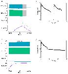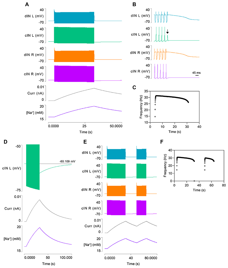 Fig. 3. Model 2 output after adding dynamic sodium pumps to cINs.A: Swim episodes elicited with the same stimulus regime as used in Model 1 (Fig. 1C) now self-terminate. Traces from top: left dIN, left cIN, right dIN, right cIN, pump current in left cIN, [Na+]i in left cIN. B: Expanded neuron traces of (A) reveal that the swim episode terminates due to spike failure in the left cIN (arrow). C: The cycle frequency of the left CIN during a swim episode. D: An enlarged view of part of (A) shows the usAHP and its recovery in the left cIN. E: Eliciting a second swim episode with the same stimulus regime shortly after termination of the first reveals STMM. F: The cycle frequency profile of (E). |