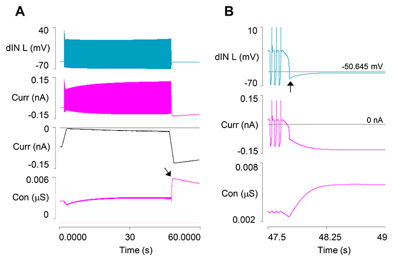 Fig. 5. The role of Ih in dINs during swimming.A: Activity profile in left dIN during a swim episode. Traces from top: membrane potential, Ih, Ih smoothed with a moving average filter with a half-window of 1s (grey line marks 0 level), HCN conductance. The conductance increases markedly above its resting and within-episode level following swim termination (arrow). B: Enlarged view of part of (A) at episode termination showing a very brief (< 1 s) large usAHP (arrow) which declines to 1.8 mV as HCN conductance increases from its low within-episode value (horizontal cursor in top trace marks RMP, in second trace marks 0-current level; smoothed current trace not shown). |