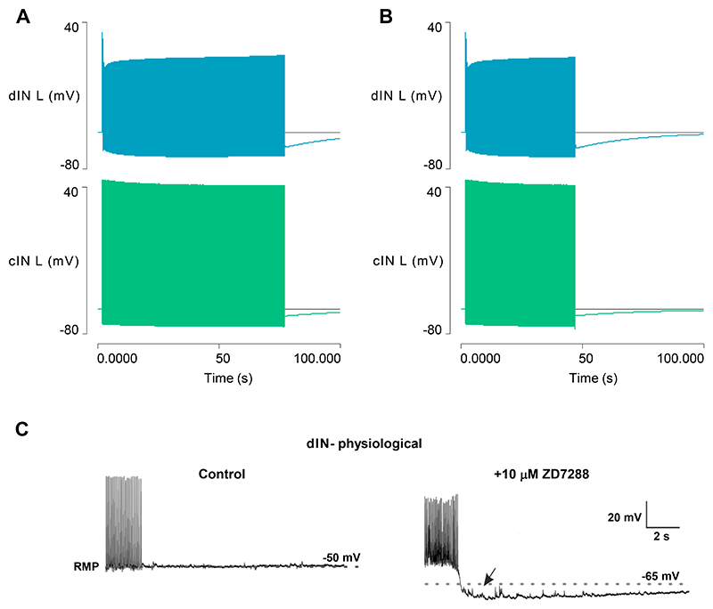 Fig. 6. Locking Ih activation reveals a large dIN usAHP after swimming.A. With HCN conductance fixed at its resting level, the episode duration increases to 75 s and the dINs express a substantial usAHP. Traces from top: left dIN, left cIN; horizontal cursors mark the RMP. B: As (A), but with the episode terminated at its normal duration (46 s) by inhibiting a cIN. The dIN still develops a considerable usAHP, although the cIN usAHP is normal. C: Pharmacological blockade of HCN channels in a real dIN reveals a usAHP and a negative shift in RMP [dashed line; adapted from (32)]. |