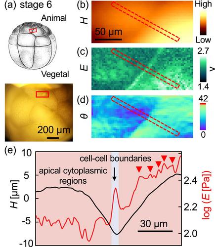 FIGURE 2 (a) Schematic morphology (upper) and an optical microscopic image (lower) of a Xenopus laevis embryo at stage 6. AFM-measured region is indicated by an open rectangle (red). The AFM mapping images of H (b) and E (c), and θ (d) estimated from (b). (e) Plots of averaged H and E values in the region denoted by open dashed-line rectangles (b–d, red). The black arrow indicates the position of the cell–cell boundary. The local regions where stiffness in the apical cytoplasmic region exceeded that at the cell–cell boundary are indicated by red arrowheads. The topography is plotted by flattening the tilt of the height image.