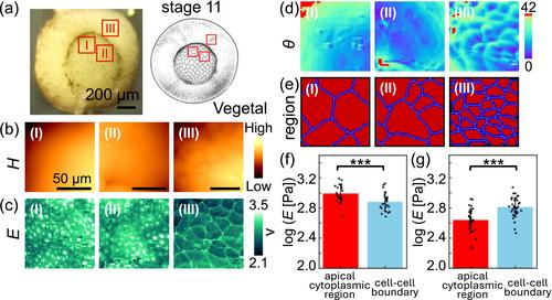 FIGURE 5 (a) An optical microscopic image and schematic image (inset) of Xenopus laevis embryo, viewed from the vegetal pole. AFM-measured regions are indicated by open squares: I and II are in the yolk plug, whereas III is in the animal region. AFM mapping images of H (b), E (c), and θ (d) estimated from (b). Measured regions of apical cytoplasmic regions (red) and cell–cell boundaries (blue) (e) segmented using Cellpose. Quantifications of stiffness in different measured regions in yolk plug (f) and animal hemisphere (g). Data are mean ± SD from 23 cells (g) and 34 cells (h) from a single embryo. For data analysis, Wilcoxon signed-rank test was used to determine p-values. ***p < 1.0 × 10−4.