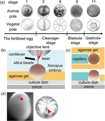FIGURE 1 (a) Schematic morphological change in Xenopus laevis embryo during the early embryogenesis from the fertilized egg to stage 11 (mid-gastrula) from Xenopus illustrations (Zahn et al. 2022), except for the stage-11 animal-pole panel, which was drawn by the authors. (b) Schematic of AFM with an upright optical microscope. Xenopus embryo was immobilized in a semi-cylindrical-groove agarose well and cultured in 1/10× Steinberg's solution. The underside morphology of the embryo was observed through a mirror placed beneath the gel plate, using the optical microscope. (c) Schematic of embryo placed in a semi-cylindrical well in a top view (upper figure) and side view (lower Figure). The embryo was slightly contacted on the edge of the agarose well (orange) and then gently held using a dulled glass capillary (green). (d) A microscope image of a developing embryo at around stage 12, viewed from the vegetal pole using the mirror. The yolk plug of the embryo is denoted by the arrowhead. After checking the stage with the image, the animal hemisphere was measured by AFM.