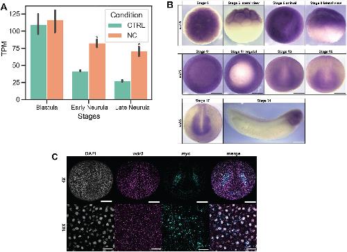 Fig. 1. Characterization of wdr5 expression. (A) Analysis of previously published RNA-Seq data (York et al., 2024) shows wdr5 transcripts are abundant in the animal pole cells of the blastula stages and differentially enriched in neural crest-induced animal caps at early and late neurula stages (*P<0.05). (B) Spatial and temporal expression of wdr5 shows that wdr5 transcripts are maternally provided, enriched in blastula stem cells and retained broadly throughout the neuroectoderm into developing neural crest stem cells and neural crest derivatives. (C) Fluorescent in situ hybridization chain reaction confirms wdr5 expression in the neural crest that colocalizes with myc a canonical neural crest and pluripotency factor. CTRL, control; NC, neural crest; TPM, transcripts per million. Scale bars: 250[micrometers] in B and C (10 images); 100[micrometers] in C (4 images). |