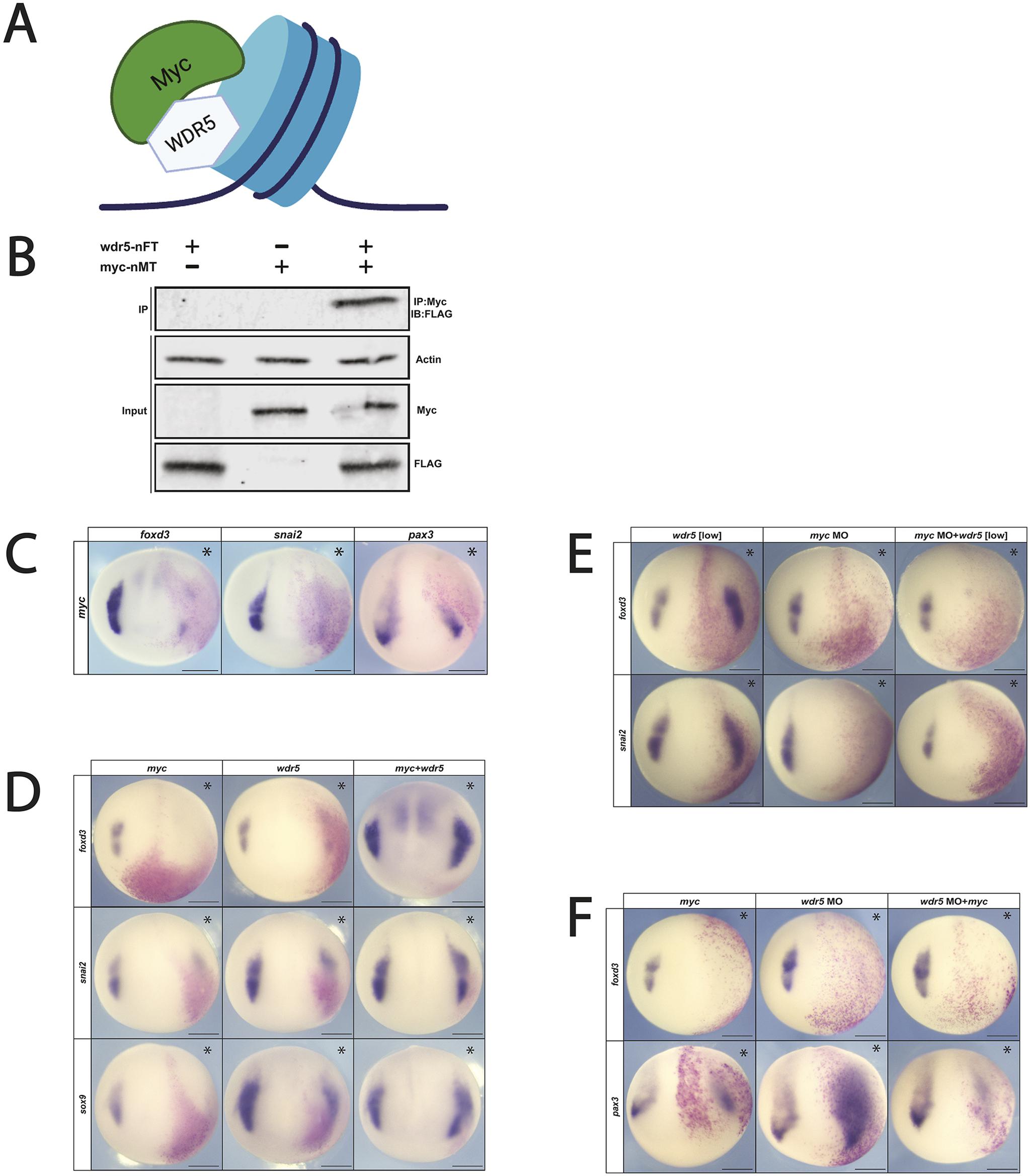 Fig. 4. Myc and Wdr5 interact directly to facilitate neural crest factor expression. (A) Wdr5 and Myc directly interact at chromatin to influence downstream gene expression of Myc target genes. (B) Western blot of Co-IP shows that FLAG-tagged Wdr5 (wdr5-nFT) and Myc-tagged Myc (myc-nMT) directly interact in Xenopus embryos. (C) myc mRNA overexpression inhibits neural crest and NPB gene expression. (D) Co- expression of wdr5 mRNA and myc mRNA facilitates neural crest gene expression. (E) myc expression is required for Wdr5-mediated neural crest expansion. (F) myc mRNA inhibits neural crest and NPB gene expression when wdr5 expression is downregulated. Asterisks indicate the injected side of the embryo. Scale bars: 250[micrometers]. |