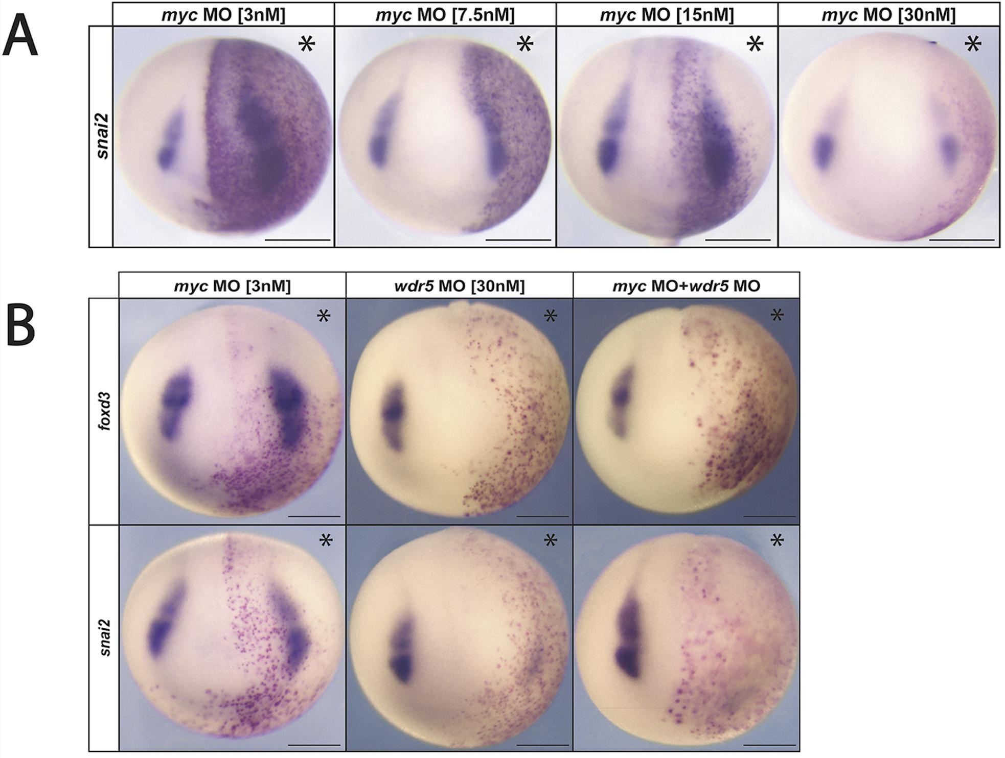 Fig. 7. Myc downregulation expands neural crest expression via wdr5 mediated mechanism. (A) Lower concentrations of myc morpholino expand neural crest factor expression. (B) wdr5 is required for myc-morpholino mediated expansion of