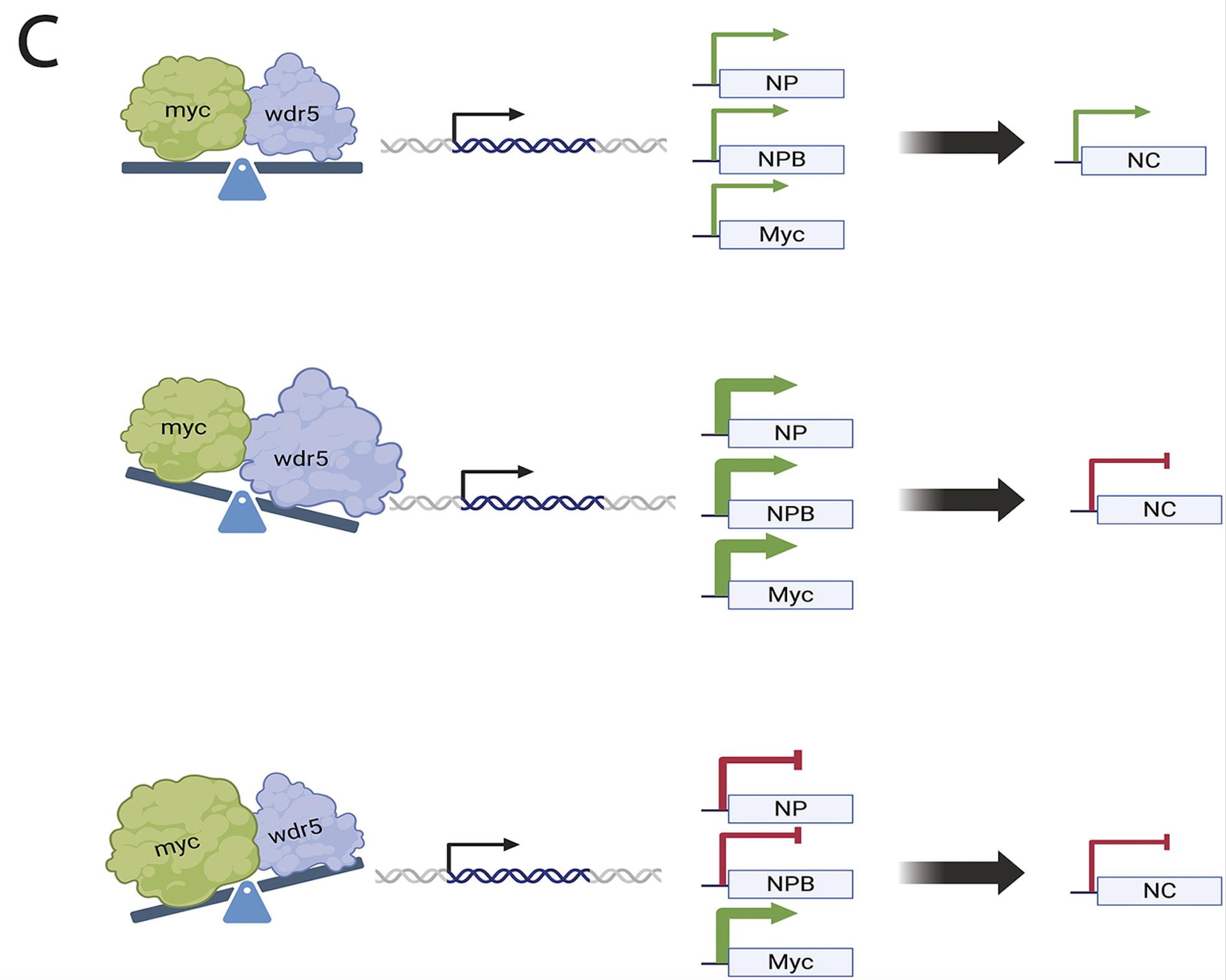 Fig. 7. Myc downregulation expands neural crest expression via a Wdr5-mediated mechanism. (C) Model depicting Wdr5- and Myc-mediated regulation of the neural crest: normal NC formation (top), loss of NC and prolonged NP and NPB (middle), loss of NC and prolonged Myc expression (bottom). Abbreviations [[NC = Neural Crest; NP = Neural