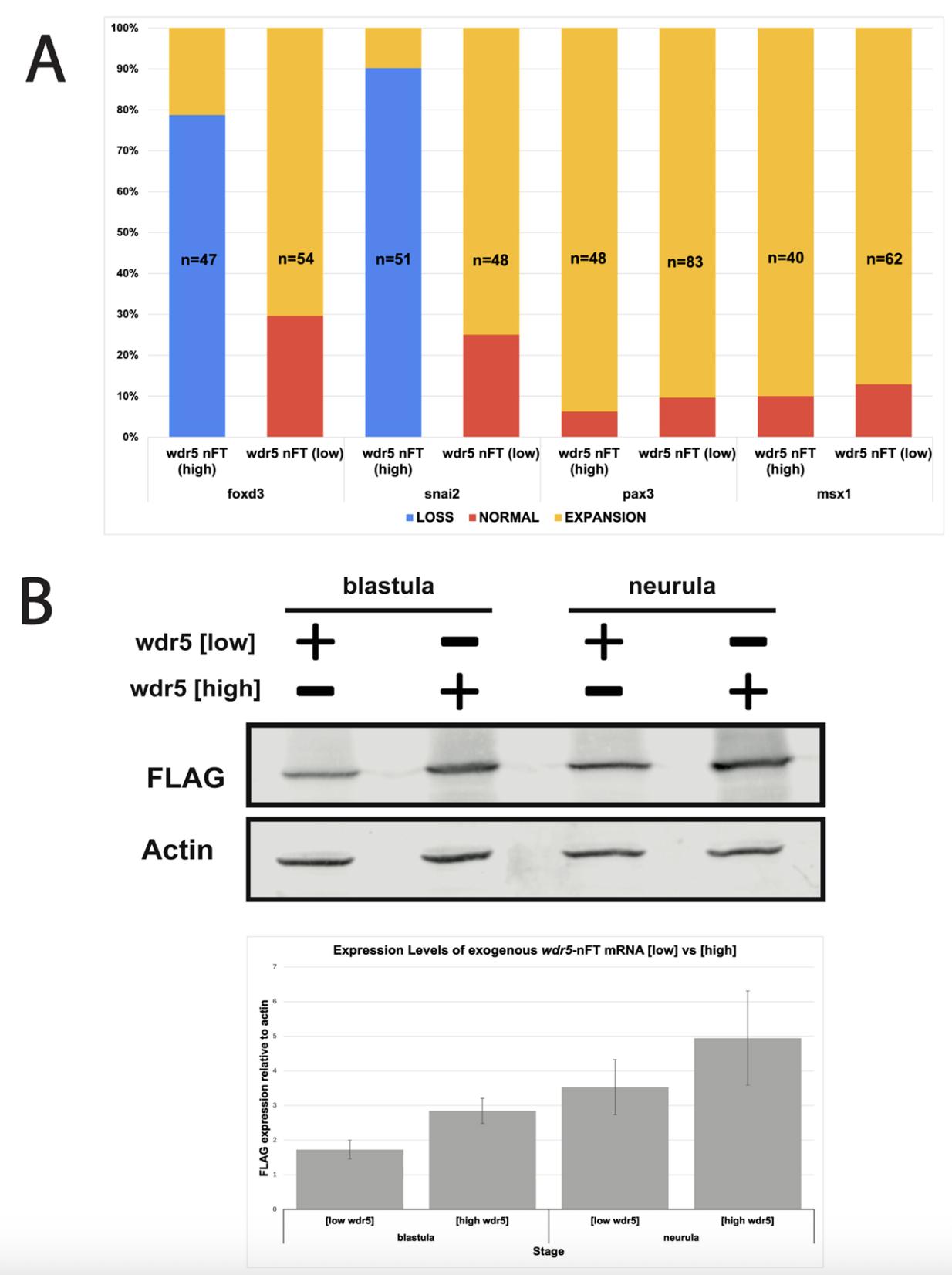 Fig. S2. (A) Percentage bar graph representing whole embryo phenotype counts for wdr5 nFT injected embryos (low vs high dose). (B) Western blot and quantification of difference in low vs high concentrations of wdr5-nFT mRNA. |