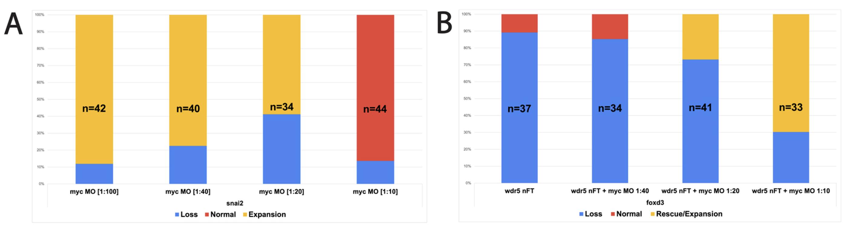 Fig. S6. (A) Percentage bar graph representing whole embryo phenotype counts for myc MO injected embryos at varying concentrations. (B) Percentage bar graph representing whole embryo phenotype counts for embryos injected with either wdr5 nFT, wdr5 nFT+myc MO at varying concentrations. Abbreviations [[ MO = morpholino ]]. |