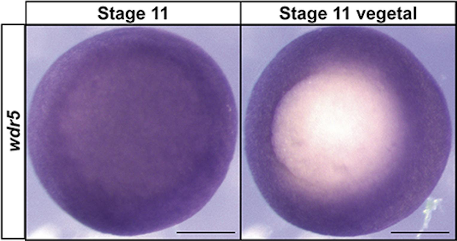 wdr5 (WD repeat domain 5) gene expression in X. laevis embryo, NF stage 9, assayed via in situ hybridization. |