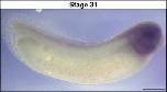 wdr5 (WD repeat domain 5) gene expression in X. laevis embryo, NF stage 29/30, assayed via in situ hybridization, lateral view, anterior right, dorsal up. |