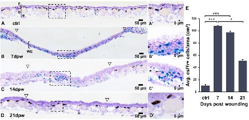 Figure 2. Csf1r+ macrophages accumulate transiently during wound repair. (AD') RNA in situ hybridization detecting csf1r+ cells (teal) in (A, A') unwounded skin and at (B, B) 7, (C, C') 14 and (D, D') 21 days post wounding (dpw). Open arrowheads mark wound edges, boxed regions indicate higher magnification in AD. (E) Quantification of csf1r+ cell density (cells/cm2). Data are mean +/-SEM (n = 4-5 biological replicates per group). One-way ANOVA with Tukeys post hoc test; *p < 0.05,***p < 0.001. |
