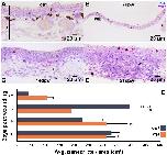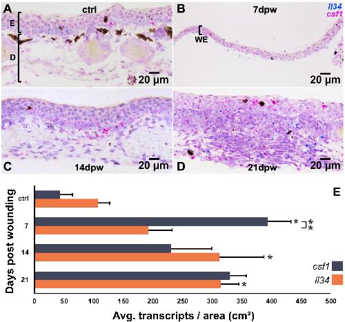 Figure 3. Expression of csf1 and il34 in regenerating skin wounds. (AD) RNA in situ hybridization detecting csf1 (magenta) and il34 (blue/teal) transcripts in (A) unwounded skin, and skin at (B) 7, (C) 14 and (D) 21 days post wounding (dpw; counterstained with hematoxylin). WE, wound epidermis; E, epidermis; D, dermis. (E) Quantification of csf1 and il34 transcript density (transcripts/cm2. Data represent mean +/- SEM (n = 4-7 biological replicates per group). One-way ANOVA with Tukeys post hoc test; p<0.05. Asterisks (*) indicate statistical significance from ctrl. Asterisks (**) above bar denotes significance between the groups indicated by the bar. *p < 0.05, ** p < 0.01. |