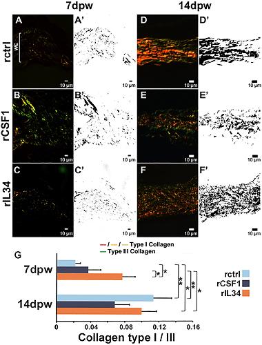 Figure 6. Collagen I and III deposition in rCSF1- and rIL34-administered wounds. (A-C') Picrosirius red (PSR) staining of (A, A') rctrl, (B, B') rCSF1, and (C, C') rIL34-administered wounds at 7 days post wound (dpw; cytokines administered 3 dpw), imaged with polarized light microscopy. Collagen I (red/orange/yellow) and collagen III (green) birefringence is shown; corresponding binary masks are in A-C'. (D-F') PSR staining of (D, D) rctrl, (E, E') rCSF1, and (F, F') rIL34 wounds at 14 dpw with corresponding masks (DF). (G) Quantification of collagen I/III ratios at 7 and 14 dpw. Data represent mean +/- SEM (n = 7-12 biological replicates per group). One-way ANOVA with Tukeys post hoc test; *p < 0.05, **p < 0.01. |