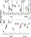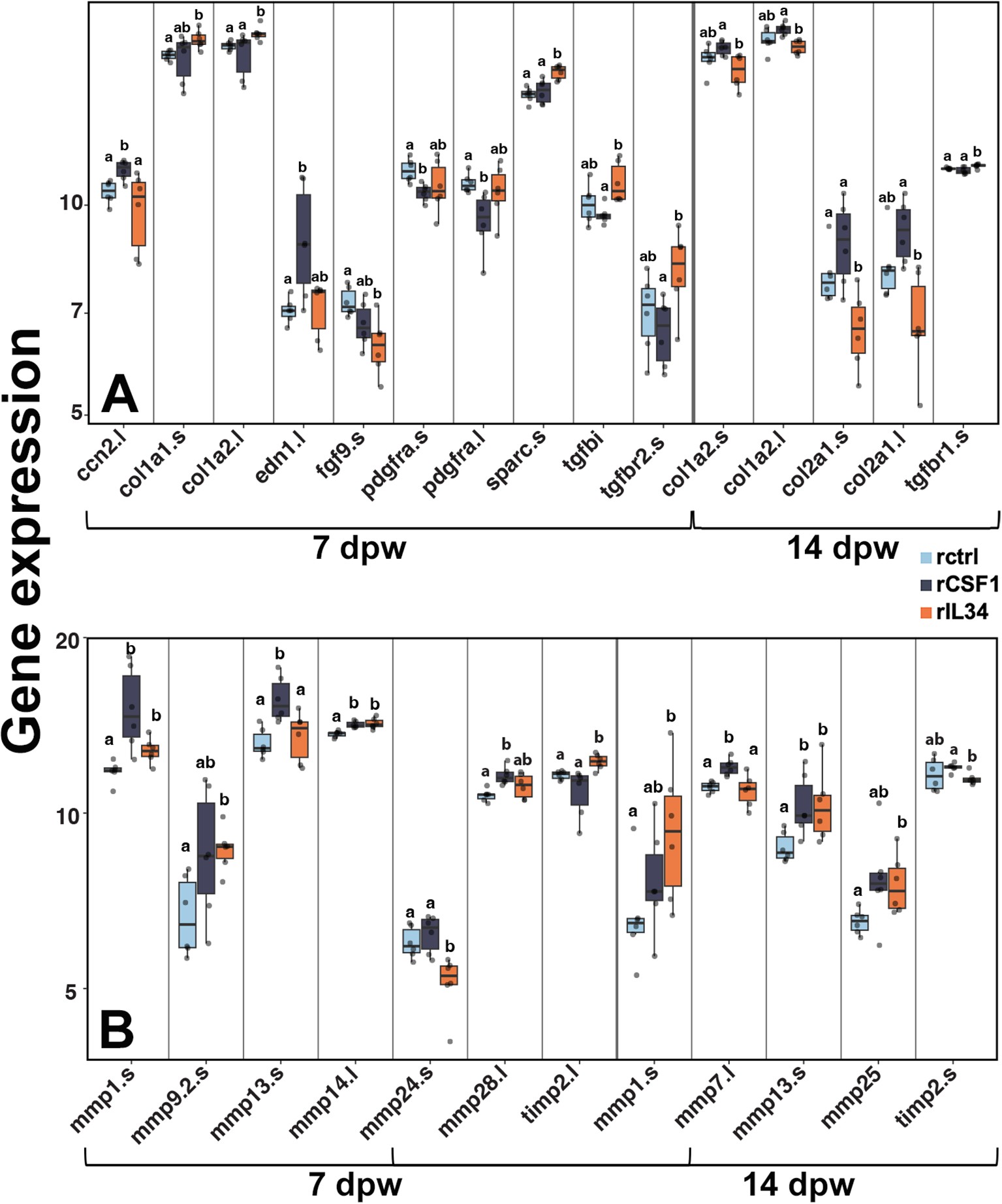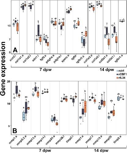 Figure 7. Gene expression in rCSF1- and rIL34-administered wounds. (A) RNA-seq expression analysis of ECM- and fibrosis-associated genes at 7 and 14 dpw across treatments. (B) RNA-seq expression analysis of matrix metalloproteinases (MMPs) and their regulators (TIMPs) at 7 and 14 dpw across treatments. Boxplots show median, interquartile range, and statistical groupings, letters denote significance; p < 0.05. |