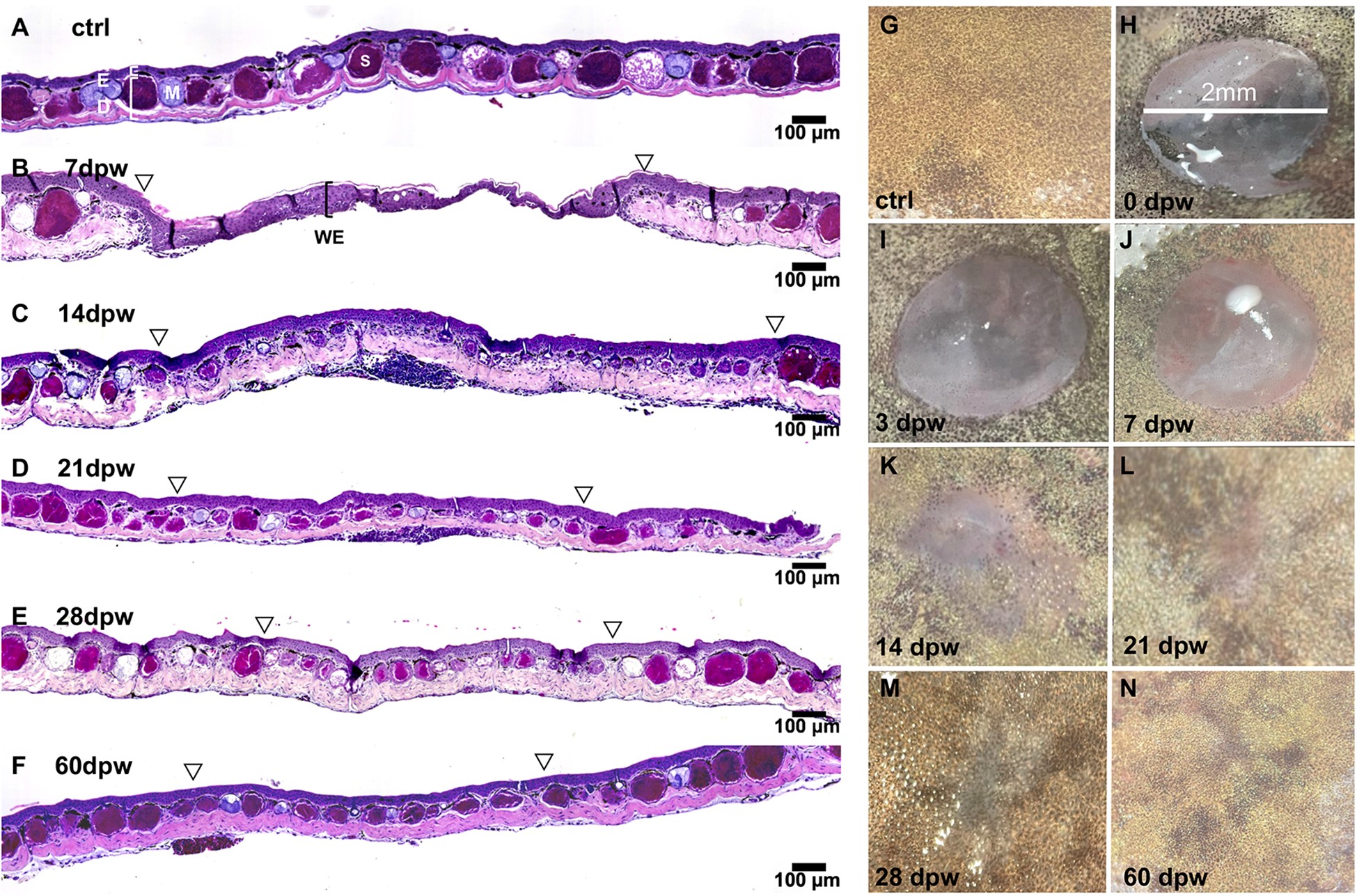 Figure 1. Juvenile X. laevis skin regeneration over time. (AF) Hematoxylin and eosin (H&E) stained skin sections from (A) unwounded controls (ctrl) and at (B) 7, (C) 14, (D) 21, (E) 28 and (F) 60 days post wounding (dpw). Open arrowheads mark wound edges. Control skin showing epidermis (E), dermis (D), and well-defined mucus (M) and serous (S) glands. WE, wound epidermis. (GN) Top-down images of (G) control skin and wounds at (H) 0, (I) 3, (J) 7, (K) 14 (L) 21, (M), 28 and (N) 60 dpw. Contrast and brightness adjusted uniformly across images. |