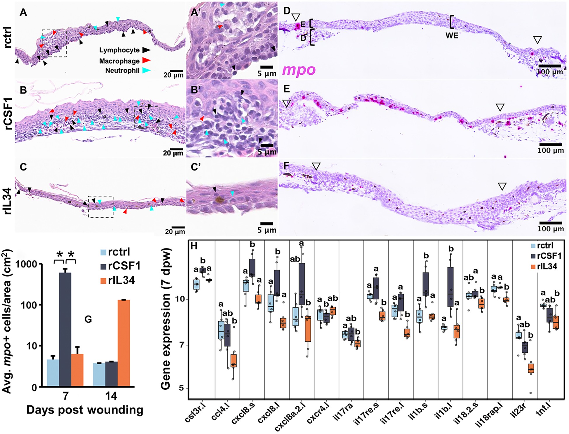 Figure 4. Analyses of histology and neutrophil infiltration of rCSF1- and rIL34-administered wounds. Histology, 7 days post wounding (dpw) of (A, A') rctrl-, (B, B') rCSF1-, and (C, C') rIL34-administered wounds (cytokines administered 3 dpw). Inset panels (A'C') depict higher magnification. Lymphocytes (black arrows), macrophages (red arrows), and neutrophils (blue arrows) are indicated. (DF) RNA in situ hybridization for mpo (magenta), visualizing neutrophil localization 7 days post wounding (dpw) in (D) rctrl-, (E) rCSF1- and (F) rIL34-administered wounds (cytokines administered 3 dpw). Open arrowheads mark wound edges. (G) Quantification of mpo+ cell density (cells/cm2) at 7 and 14 dpw. Data are mean +/- SEM (n = 3-7 biological replicates per group). Statistical comparisons were performed using one-way ANOVA with Tukeys post hoc test; *p < 0.05. (H) Expression analysis of inflammatory response genes at 7 dpw across treatments. Boxplots represent medians with interquartile range; letters indicate statistically distinct groups (p < 0.05, pairwise Wilcox test). |