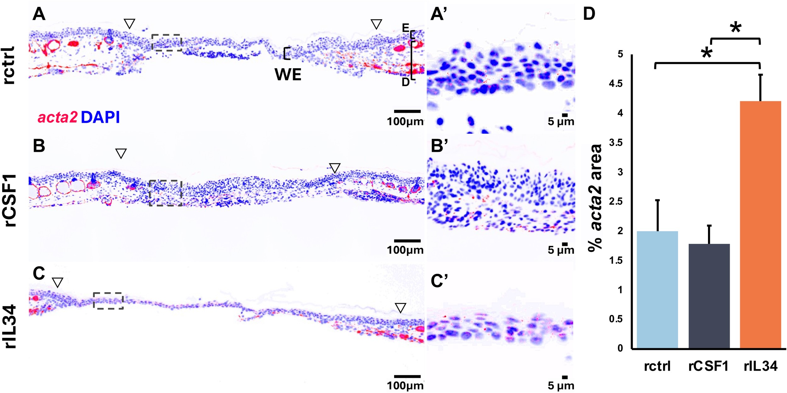 Figure 5. Myofibroblast accumulation in rCSF1- and rIL34-administered wounds. (A-C') Immunofluorescence staining of (red) acta2 and (blue) DAPI in (A, A') rctrl, (B, B') rCSF1, and (C, C') rIL34 wounds at 7 dpw (cytokines administered 3 dpw). Open arrowheads mark wound edges, boxed regions indicate sections of higher magnification in (A'-C'). (D) Quantification of acta2 area (% total wound region, excluding gland-adjacent expression). Data represent mean +/- SEM (n = 4-7 biological replicates per group). One-way ANOVA with Tukeys post hoc test; *p < 0.05. Images were created using fluorescent microscopy and inverting uniformly in ImageJ. |