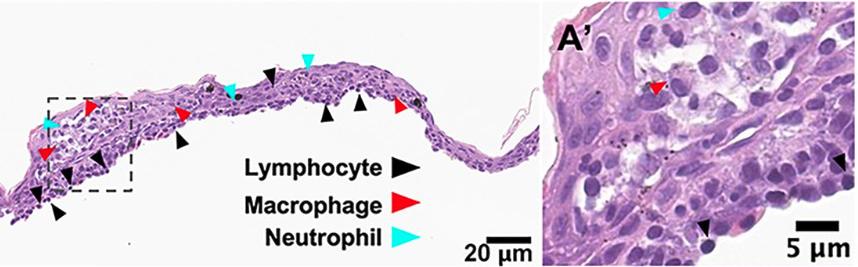 Juvenile X. laevis skin section, Hematoxylin and eosin (H&E) stained epidermis (unwounded ) with Inset A' depicting higher magnification. 3 key cell types, Lymphocytes (black arrows), macrophages (red arrows), and neutrophils (blue arrows) are indicated. |