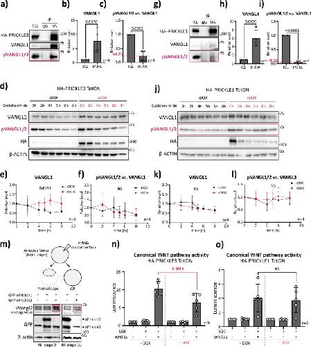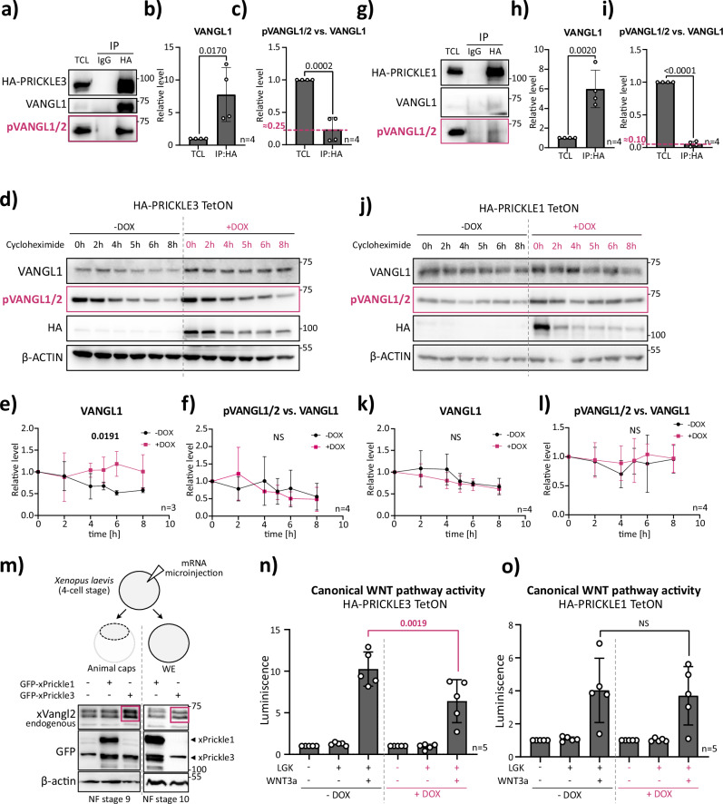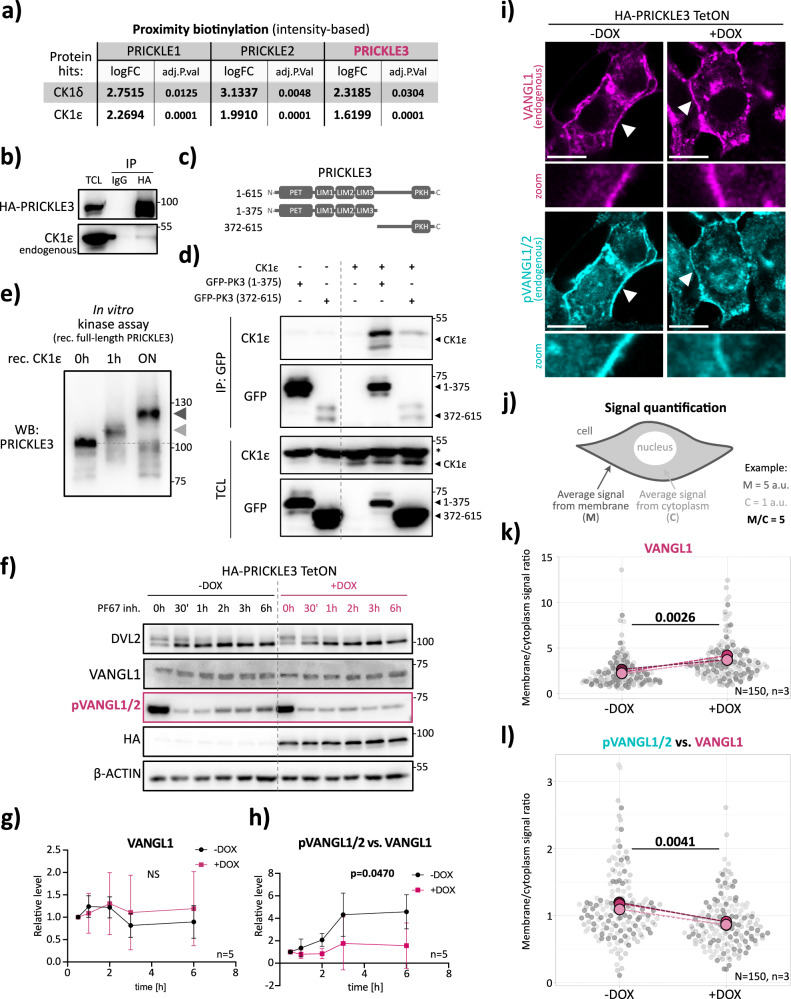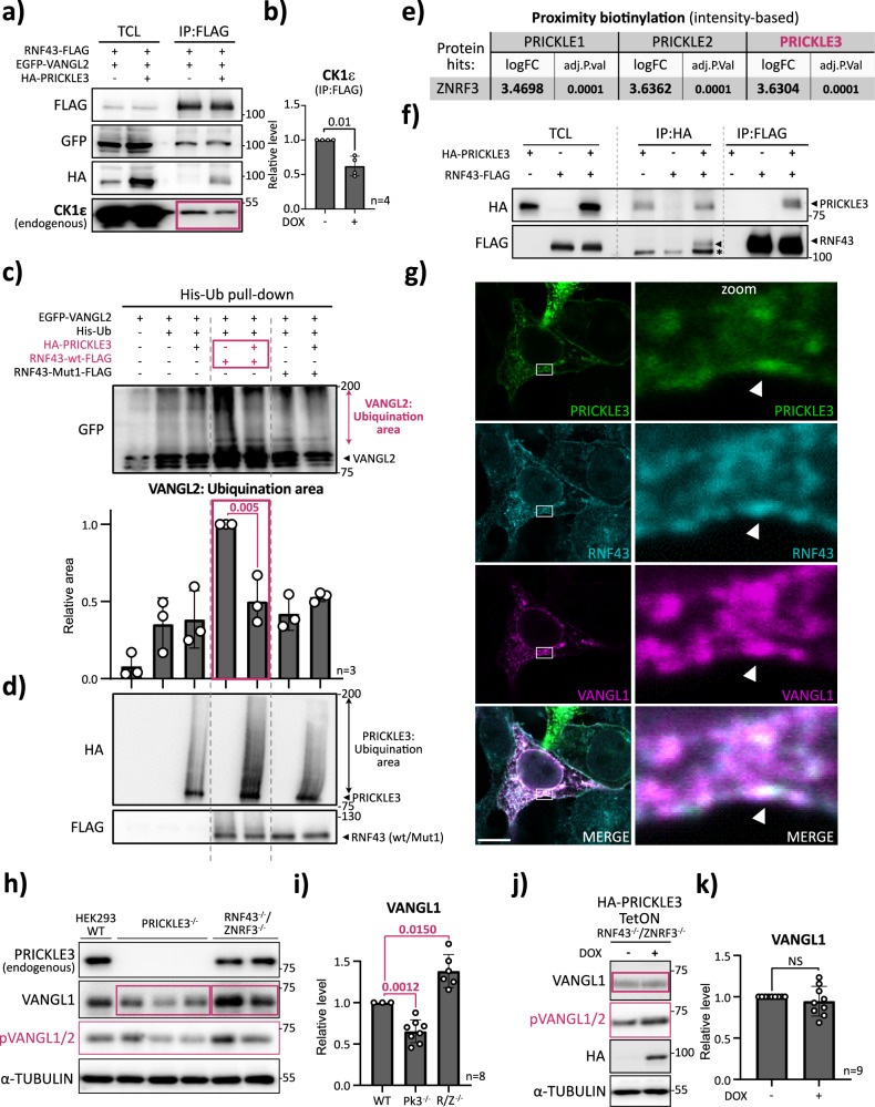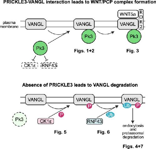 PRICKLE3 protects VANGL proteins from CK1-mediated phosphorylation and RNF43-mediated degradation.