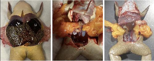 Fig 1. Dissected ventral views of a X. laevis wildtype female (left), and female knockouts for dmrt1.L (X. laevis, center) and dmrt1 (X. tropicalis, right). The egg-filled oviduct (E) is visible in wildtype females but knockouts of X. laevis dmrt1.L and X. tropicalis dmrt1 do not develop eggs; these animals have large fat bodies (F; orange-yellow structures), which are also present but much smaller in wildtype females (in the left, this obscured by the egg-filled oviduct). Other organs are labeled including the liver (Li), intestine (In), Lung (Lu), Stomach (St), and Kidney (Ki). Sample identification numbers are X. laevis wildtype: female5; X. laevis female knockout for dmrt1.L: female1; X. tropicalis female knockout for dmrt1: female1.