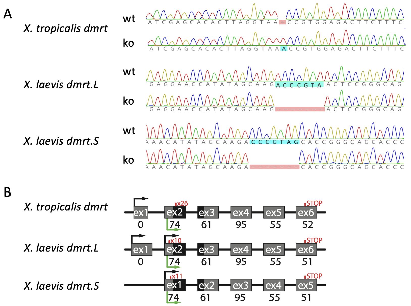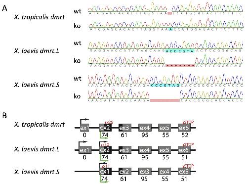 [Supplementary Figures] Fig A. (A) Sanger sequences of wildtype (wt) and homozygous knockout (ko) individual of X. tropicalis (top) and X. laevis (middle, bottom) illustrate loss of function frameshift mutations including a 1 bp deletion in X. tropicalis, and two independent 7 bp deletions in X. laevis dmrt1.L and dmrt1.S. Each mutation is in the coding region and very near the start codon (by interrupting the 26th, 10th, or 11th amino acid out of 337 or 336 in total; see main text). (B) Distributions of exons (gray boxes), introns and flanking non-transcribed regions (black lines), the DM domain (black boxes in exons), and locations of frameshift mutations (red x followed by the first amino acid position that is affected by the mutation). Starts of transcription are indicated with black arrows, including both isoforms of dmrt1.L; start and stop of translation are indicated with a green arrow and STOP respectively. The number below exon indicate the number of amino acids encoded in wildtypes.