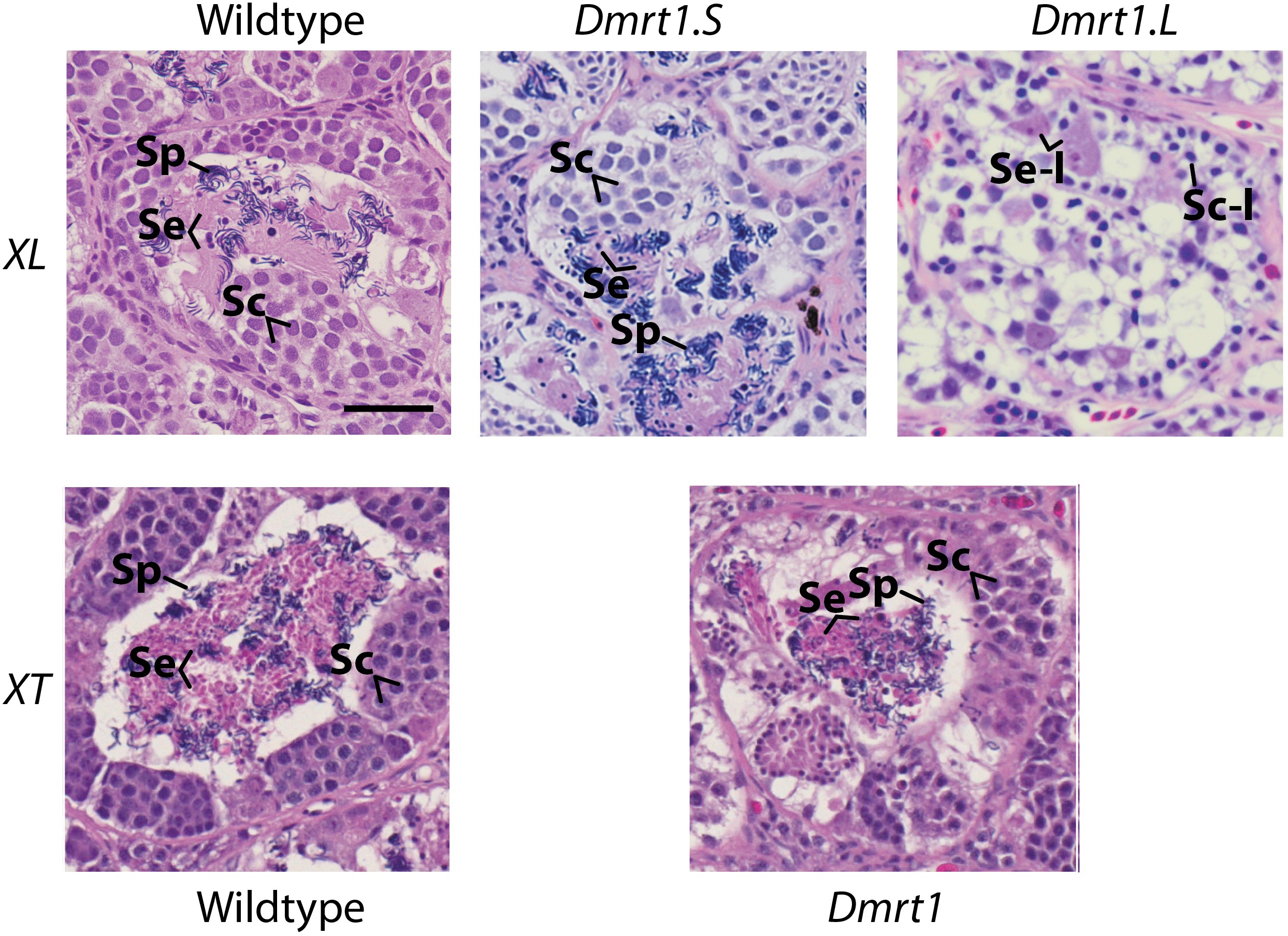 The black bar in the upper left is 50 μm; spermatocytes (Sc), Sertoli cells (Se), and late spermatids (Sp) are labeled, except for dmrt1.L where spermatocyte-like (Sc-l) and Sertoli-like (Se-l) cells are labeled and spermatids are not present. Sample identification numbers are X. laevis wildtype: 1841; X. tropicalis wildtype: 1900; X. laevis dmrt1.S: 197A; X. laevis dmrt1.L: 1929; and X. tropicalis dmrt1: 1993. Scale bar is 50μm.