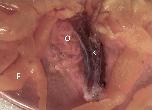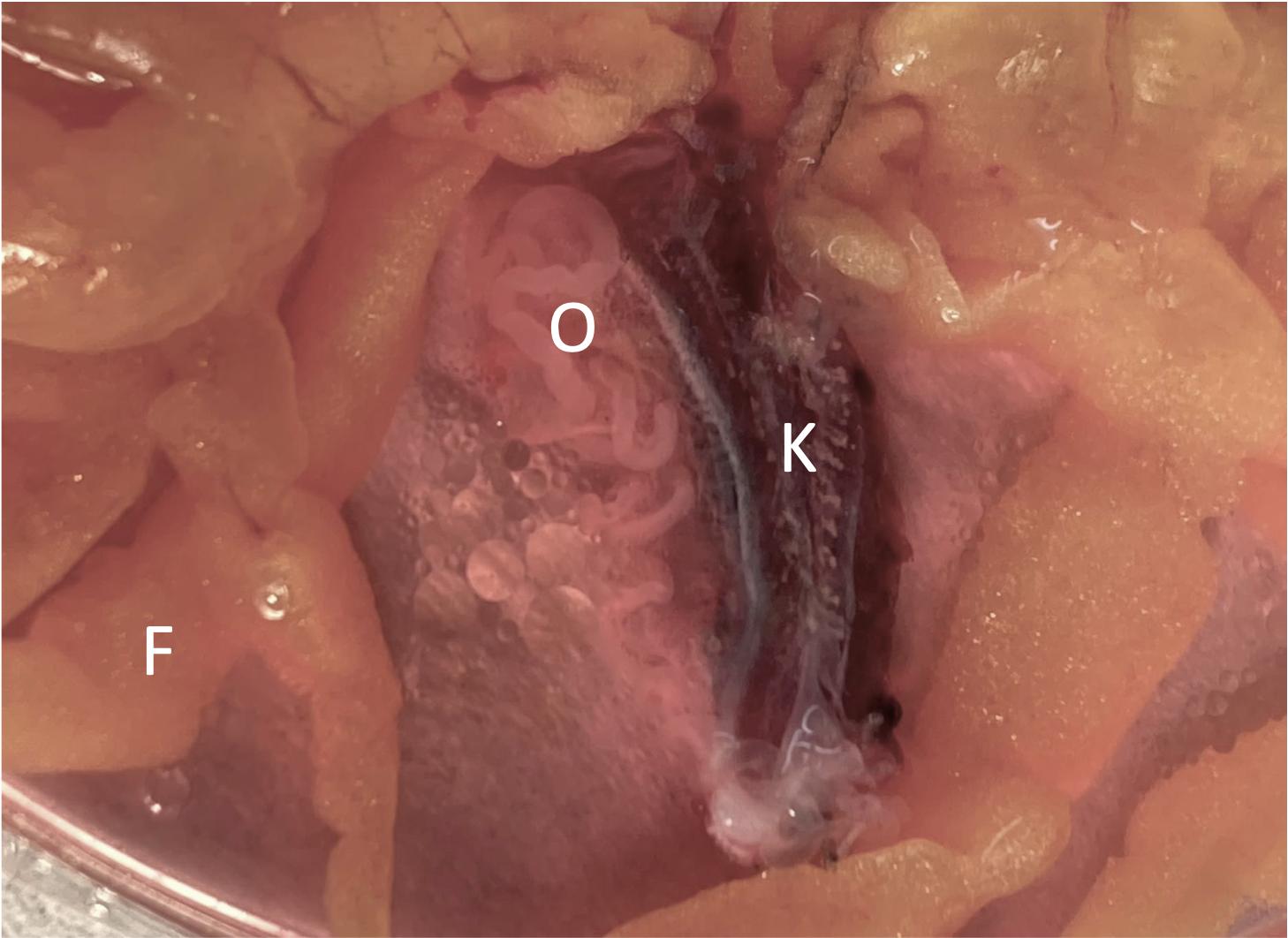 [Supplementary Figures] Fig B. Empty oviducts (O) associated with the dissected of the kidney (K) and fat bodies (F) an X. laevis dmrt1.L homozygous knockout female. The ventral surface of the kidney is shown; anterior is on the top of the image.