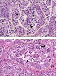 Fig 2. Testis histology of wildtype and knockout lines for X. laevis (XL) and X. tropicalis (XT) dmrt1.L, dmrt1.S, and dmrt1.