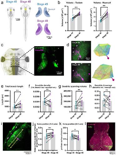 FIGURE 1. Morphometric changes in the tadpole tectum between stages 45 and 48. (a) Illustration of the tadpole and tadpole tectum at Stages 45 and 48. The neuropil of the tectum is represented by darker colors. (b) Volume of the tectum and tectal neuropil increased significantly from Stages 45 to 48. (c) (Left) Schematic of a tadpole with hemimosaic GCaMP6s expression restricted to the left half of the animal. (Right) Two‐photon optical section showing GCaMP6s expression limited to tectal cells in the left and RGC axons in the right tectal hemisphere. A single postsynaptic cell in the left tectal hemisphere was labeled with Alexa Fluor 594 dextran fluorescent dye. (d) (Left) Maximum projection images of the left tectal hemisphere of the same tadpole at Stages 45 and 48, with a single postsynaptic tectal neuron labeled with Alexa 594 dextran. (Right) Reconstructions of the dendritic tree of the dextran‐labeled cell, with colored patches showing the boundaries of its 3D spanning volume. (e) Dendritic total branch length increased from Stages 45 to 48. (f) Dendrite density, calculated as total branch length divided by neuropil volume, did not change significantly. (g) Dendrite spanning volume increased from Stages 45 to 48. (h) Dendrite coverage, calculated as dendrite spanning volume divided by neuropil volume, did not change significantly. (i) Position of the cell soma along the rostrocaudal (R–C) axis was calculated as the distance from the soma to the caudal limit of the tectum divided by the full length of the R–C axis. (j) Labeled neuronal somata shifted rostrally from Stages 45 to 48. (k) Position of the cell soma along the dorsoventral (D–V) axis. From Stages 45 to 48, cell somata shifted deeper below the dorsal surface of the tectum. (l) β‐Tubulin and CldU labeling in the tectum of an animal treated with 10 mM CldU for 2 h at Stage 45 and sacrificed at Stage 48. CldU labeling can be seen distributed in the cell body layer in a laminar fashion, consistent with new tectal cells being added in layers from the caudal end of the tectum. CldU puncta can also be seen sparsely distributed in the tectal neuropil. All paired comparisons were done using Wilcoxon matched pairs test, n = 10 animals, *p < 0.05, **p < 0.01.