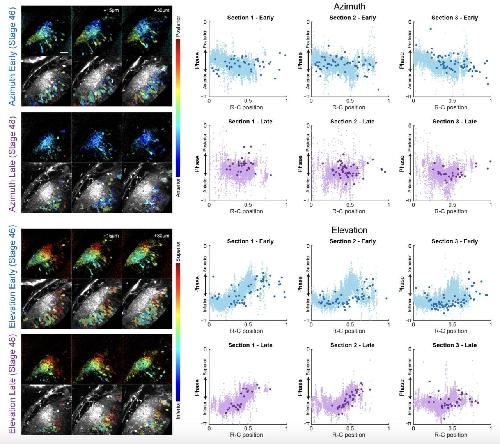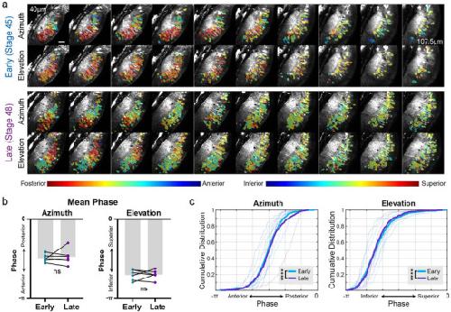 Fig S3: Comparing retinotopic gradients in three matched optical sections from the same animal at early and late stages.