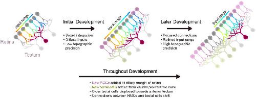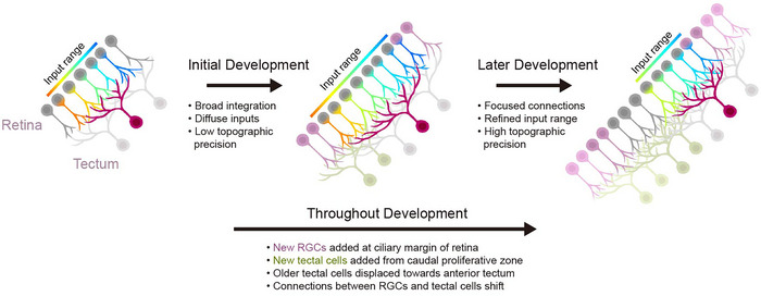 FIGURE 5. Stage‐dependent change in retinotectal input wiring mechanisms during development. The initial development of the retinotectal projection is characterized by broad integration of multiple RGC inputs representing a large portion of the visual field, as demonstrated by results in the current study. In this phase, the dendritic arbors of tectal neurons grow at a pace proportionate to the overall growth of the optic tectum. In later development, there is a refinement of visual receptive fields, presumably as a result of activity‐dependent input selection. Throughout development, the retina grows radially by adding RGCs at the ciliary margin, whereas the tectum adds cells in a caudomedial proliferative zone, displacing older cells toward the anterior tectum. To maintain an orderly topographic representation, RGCs and tectal neurons must shift their connections. RGC, retinal ganglion cell.