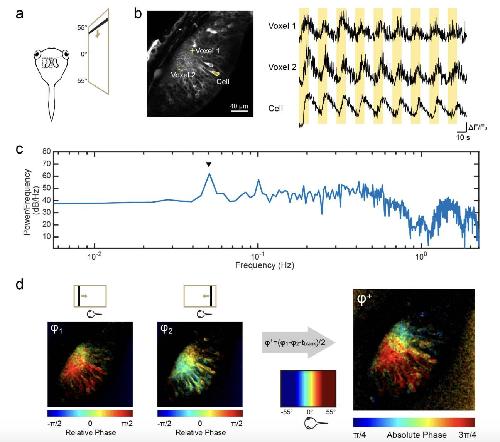 (a) Schematic of the imaging setup for receptive field mapping. The tadpole is positioned parallel to the LCD screen, with the eye to be stimulated aligned to the center of the bottom edge of the display area. From this viewpoint, the display area spans 110° visual angle in azimuth and 60° in elevation. Each cycle of the mapping stimulus consisted of a bar slowly traversing the screen once over 10 s, followed by 10 s of blank period. (b) Example visual responses to a mapping stimulus consisting of a vertical dark bar drifting from anterior to posterior field, taken from 2 neuropil voxels and 1 cell body ROI after Gaussian filtering. Yellow highlights indicate when the drifting bar was visible. The stimulus was repeated 9 times. (c) Power spectrum of the first differential of the response trace from Voxel 2. A peak in power (arrowhead) can be seen at the stimulation frequency (0.05 Hz). (d) To calculate the azimuth receptive field map, phase maps were first extracted from responses to opposite direction drifting bars (φ1 and φ2), then the absolute phase (φ+) was calculated by taking the difference between them. tblank represents the fixed interval between each bar sweep. For voxel-wise receptive field maps, pixel intensity values in map images represent the SNR of the corresponding voxels. For the absolute phase map, SNR for each voxel is defined as the smaller of the two SNR values recorded for that voxel’s responses to opposite direction drifting bars.