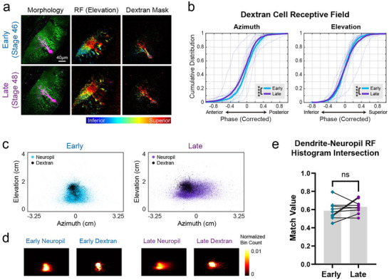 FIGURE 3. Receptive fields measured at the dendrites of single tectal neurons at different developmental stages. (a) Example optical section from the same animal imaged at Stages 46 and 48: (Left) Morphology of the tectum with a single‐cell electroporated dextran‐labeled neuron. (Middle) Elevation receptive field maps (pixel intensities indicate SNR). (Right) Elevation receptive field maps overlaid with mask of dextran labeling. (b) Cumulative distribution of receptive field phase values recorded from areas in the neuropil with dextran labeling (n = 9 animals, 10 optical sections for each animal). Thin lines show data from individual animals, downsampled to 200 data points for each animal. Thick lines show pooled data from all animals. Phase values were corrected by mean centering (see Section 4). Pooled data from all nine animals show significant difference between early and late stages for both azimuth and elevation (Kolmogorov–Smirnov test, ****p < 0.0001). (c) RF phase values from the animal in (a) (data from 10 optical sections) mapped onto the stimulus display field. Colored scatter points represent data points from the neuropil; black scatter points represent data points from areas in the neuropil with dextran labeling. (d) Heat maps showing the data from (c) binned into 2D histograms (50 × 50 bins. Bin counts were normalized so that the sum of all bin counts in each histogram equals 1). (e) The match value (see Section 4) between RF histograms for neuropil and dextran‐labeled cells was high (median 0.58 for early stage and 0.62 for late stage) and didn't change significantly between early and late stages (Wilcoxon matched pairs test, n = 9 animals).