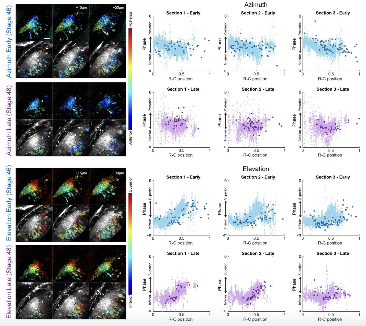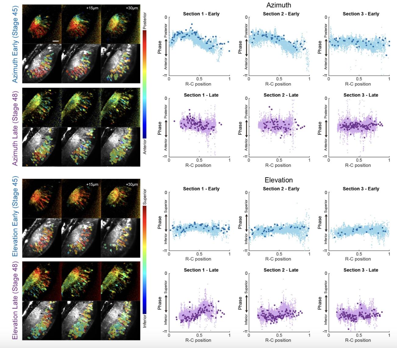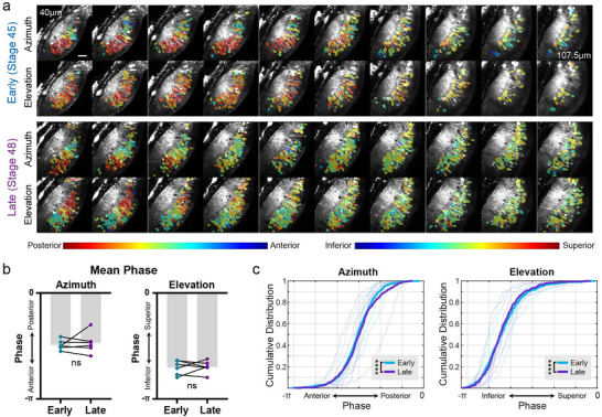 FIGURE 4. Receptive fields of tectal neuron cell bodies across developmental stages. (a) Azimuth and elevation cell body receptive field maps from the same animal and showing the same optical sections as in Figure 2a. RF phase values were calculated from the mean ΔF/F trace for each cell body ROI. Only cells with SNR > 2 are shown. Scale bar is 40 µm. (b) Mean cell body RF phase (n = 6 animals). There was no significant difference between early and late stages (Wilcoxon matched pairs test). (c) Cumulative probability distributions of cell body RF phase values. Thin lines show data from individual animals (n = 6), downsampled to 100 cells for each animal. Thick lines show pooled data from all animals. Pooled data reveal a small difference between early and late stages for both azimuth and elevation (Kolmogorov–Smirnov test, ****p < 0.0001). For the analyses in (b) and (c), only cells with SNR > 2 were included, corresponding to 42.8% of total segmented cells for Azimuth/early, 55.9% for Azimuth/late, 45.4% for Elevation/early, and 62.3% for Azimuth/late.