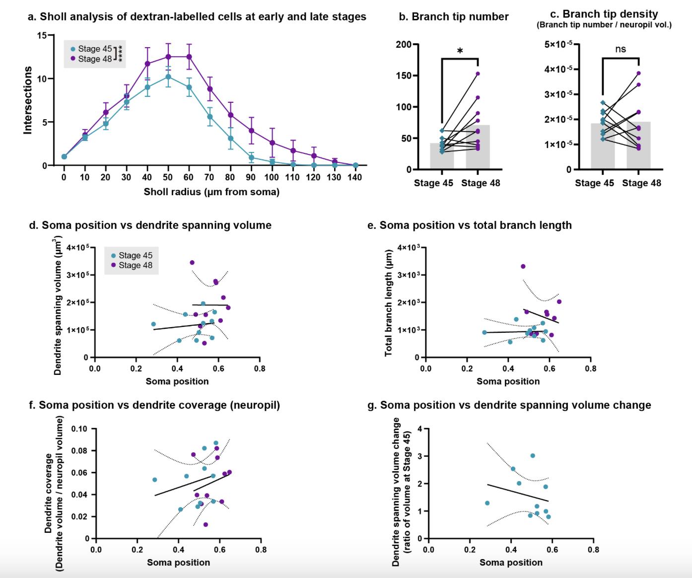 (a) Sholl analysis for dextran-labelled cells at Stage 45 and 48 (mean ± SEM number of intersections, n=10 animals). Two-factor repeated measures ANOVA for stage and Sholl radius found significant main effects for both stage and Sholl radius (Stage F(1,135) = 35.55, ****p < 0.0001); Sholl radius F(14,135) = 22.45, ****p < 0.0001). (b) Branch tip number for dextran-labelled cells increased significantly from stage 45 to 48 (Wilcoxon matched pairs test, n=10 animals, *p < 0.05). (c) Branch tip density (number of branch tips per neuropil volume) did not change significantly (p = 0.9219). (d~g) Relationships between various morphometric measurements of dextran-labelled cells and the position of their cell soma along the rostro-caudal axis of the tectum. Solid and dotted lines show linear regressions (performed separately for stage 45 and 48 data) and their 95% confidence intervals. (d) Soma position vs dendrite spanning volume. Slopes for linear regressions were not significantly different from zero (p45 = 0.6594, p48 = 0.9950). (e) Soma position vs total branch length. Slopes for linear regressions were not significantly different from zero (p45 = 0.8643, p48 = 0.5366). (f) Soma position vs dendrite coverage. Slopes for linear regressions were not significantly different from zero (p45 = 0.4535, p48 = 0.5310). (g) Soma position at Stage 45 vs change in dendrite coverage between Stage 45-48. Slope for linear regression was not significantly different from zero (p = 0.5045).